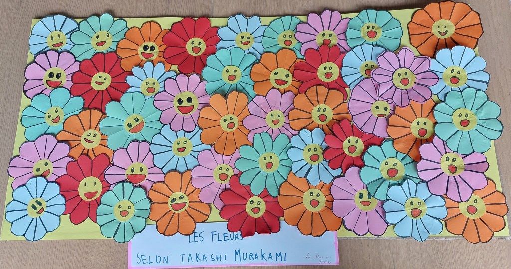En lien avec ce pays, en classe, les élèves ont regardé une vidéo sur Takashi Murakami, un artiste japonais très connu – le meilleur dans son domaine- qui fait des œuvres monumentales.