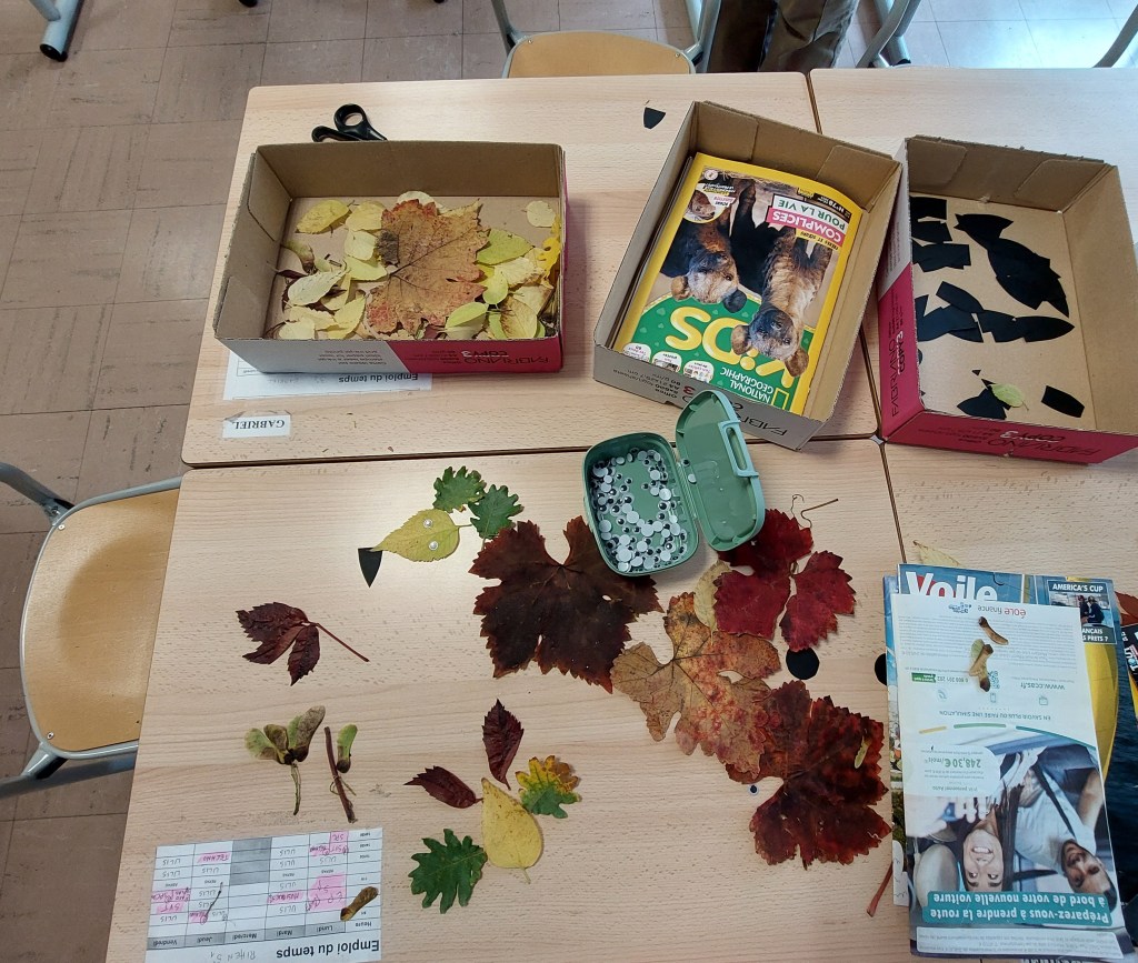 Nous avons utilisé de la colle, des yeux en plastique et des feuilles de différentes tailles, formes et couleurs: rouge, jaune, orange, brun. L’AESH du dispositif, Anne, avait découpé des feuilles noires pour le nez, les yeux et les oreilles des animaux. Nous nous sommes inspirés de modèles projetés sur le tableau. Nous avons fait un hibou, un hérisson, un écureuil, un renne et des renards.