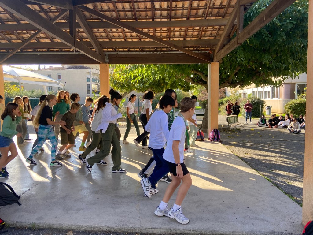 A 10h15, à la fin de la pause, les élèves volontaires se sont réunis sous le préau pour l’interprétation d’une chorégraphie répétée durant la semaine avec les professeurs d’EPS. Au son de « Happy » de C2C, les élèves ont partagé un agréable moment de convivialité et de partage. Tous les autres élèves assis dans la cour, ainsi que tous les membres de l’équipe pédagogique et encadrement de l’établissement les ont admiré et encouragé.