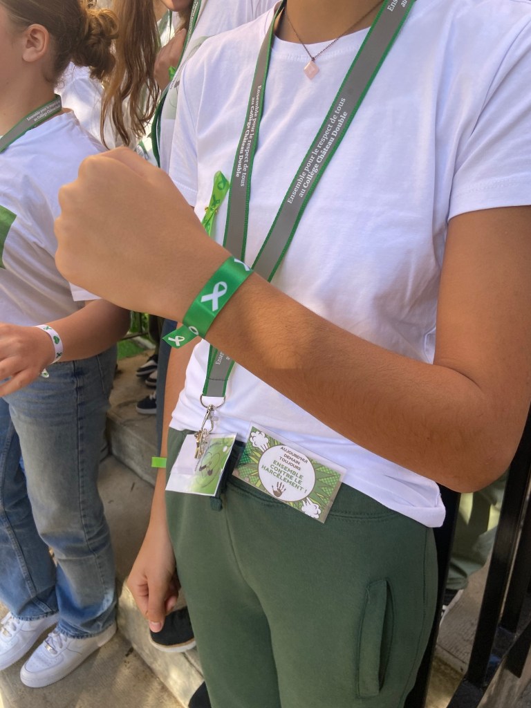 Dès 7h45, les élèves ambassadeurs qui sont une vingtaine dans l’établissement ont distribué des pin’s à l’entrée du collège à tous leurs camarades. Ce petit ruban vert, épinglé sur chacun, se voulait être le symbole d’une communauté unie face au fléau du harcèlement.