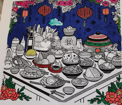 年年有余 nian nian you yu, expression qui signifie avoir une année propice au cours de laquelle on ne manque de rien, et qui se répète chaque année. Le dernier caractère 余 se prononçant comme 鱼(yu- poisson), il est donc important de manger du poisson lors du repas du réveillon, pour être sûr de ne manquer de rien au cours de l’année qui arrive.