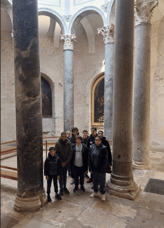 Nous sommes rentrés à l’intérieur de la cathédrale où nous avons découvert la voie romaine et l’architecture romane et gothique. Une dame nous a présenté un tableau représentant St-Mître, le Saint Patron d’Aix, décapité et elle nous a raconté son histoire .