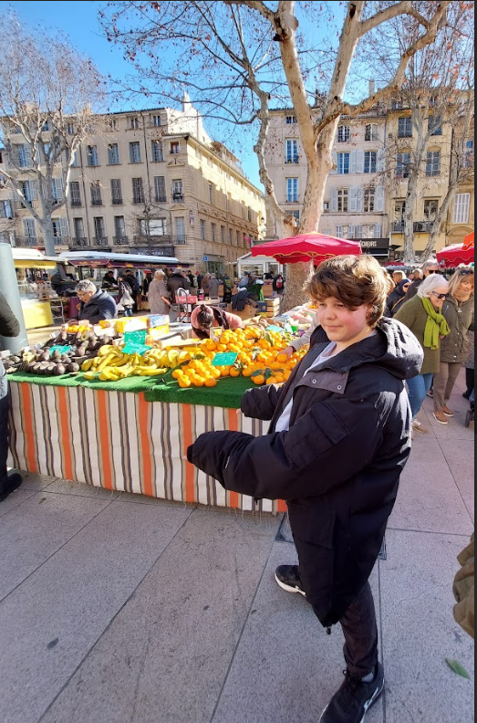 mené une enquête pour trouver le prix de certains fruits et légumes. Nous devions repérer aussi les fruits et légumes que nous ne connaissions pas. Nous avons acheté des pommes pour les cuisiner en classe. Puis nous avons marché jusqu’à un deuxième marché devant le tribunal. Nous sommes passés par l’étroit passage Agard pour rejoindre le cours Mirabeau et aller jusqu’à l’arrêt de bus près de la fontaine de la Rotonde.