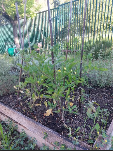 Puis, nous avons planté des tomates, des fleurs, de la menthe et des bulbes. Pour les tomates, nous avons installé des tuteurs pour les stabiliser.