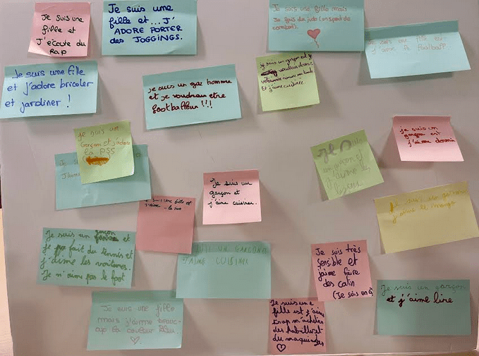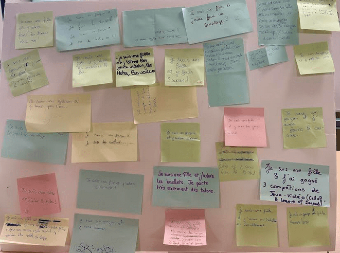 Ils ont ensuite pu s’exprimer sur leur personnalité propre en quelques phrases pour dépasser les préjugés sur les filles et les garçons. Leurs écrits ont été affichés à l’aide de post-it au CDI.