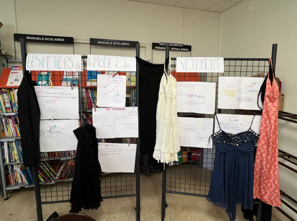 Les 5e5 ont quant à eux travailler, dans le cadre du parcours avenir, sur les métiers de la mode et du vêtement à cette occasion. Ils ont mis en lumière les professions en lien avec la production de vêtements, métiers impactés par la production massive des entreprises de fast fashion: couturier(e), styliste, coloriste, chef(fe) marketing, retoucheur(se), etc…